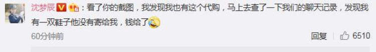 女星沈梦辰留言称,发现自己也有该代购,检查聊天记录后发现貌似有一双鞋子她已付款但对方未发货。