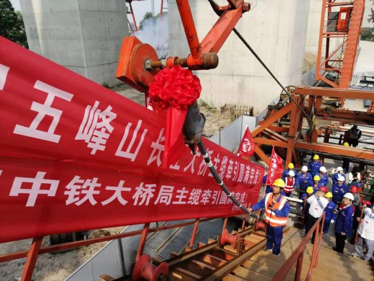 今天上午,连淮扬镇铁路五峰山长江特大桥最后两根长1934米、重46吨的主缆索股双双锁定在南锚碇两侧的352号锚杆上,大桥704根主缆索股全部架设完成。