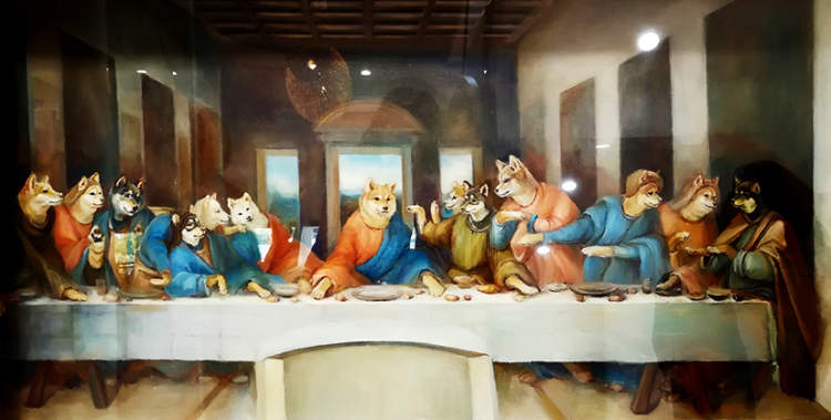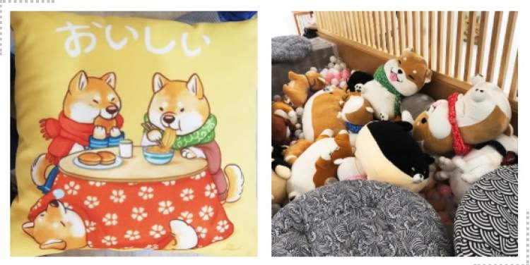 上楼之后,扑面而来的柴犬元素如排山倒海般映入周到君的眼帘——主角是柴犬,玩偶是柴犬,靠枕是柴犬,连店内装饰的“世界名画”,也都是柴犬……