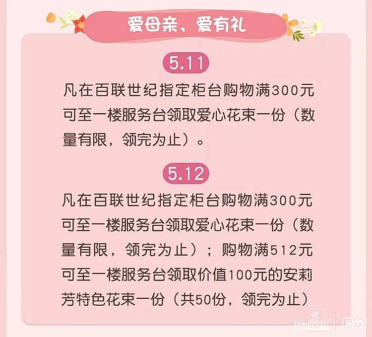 周末两天去百联世纪的小伙伴,如果满足了相应的消费额度,记得去给妈妈领一份美美的花花哦~