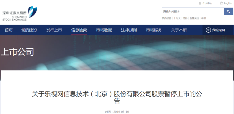 据深交所官网,乐视网信息技术(北京)股份有限公司(300104)因触及《创业板股票上市规则(2018年11月修订)》第13.1.1条规定的暂停上市情形,依据深交所上市委员会的审核意见,本所决定自2019年5月13日起暂停乐视网信息技术(北京)股份有限公司股票上市。