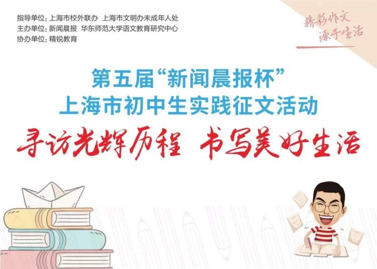 为引导和鼓励广大青少年关注社会、热爱生活、积极实践、热情写作,在上海市青少年学生校外活动联席会议办公室、上海市精神文明建设委员会办公室未成年人工作协调处的共同指导下,新闻晨报与华东师范大学语文教育研究中心联合主办、精锐教育协办的第五届“新闻晨报杯”上海市初中生实践征文活动于2018年12月至2019年3月成功举办,共收到来自全市16个区、百余所学校的七万余篇投稿作品,活动取得了圆满成功。