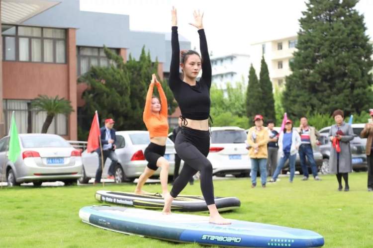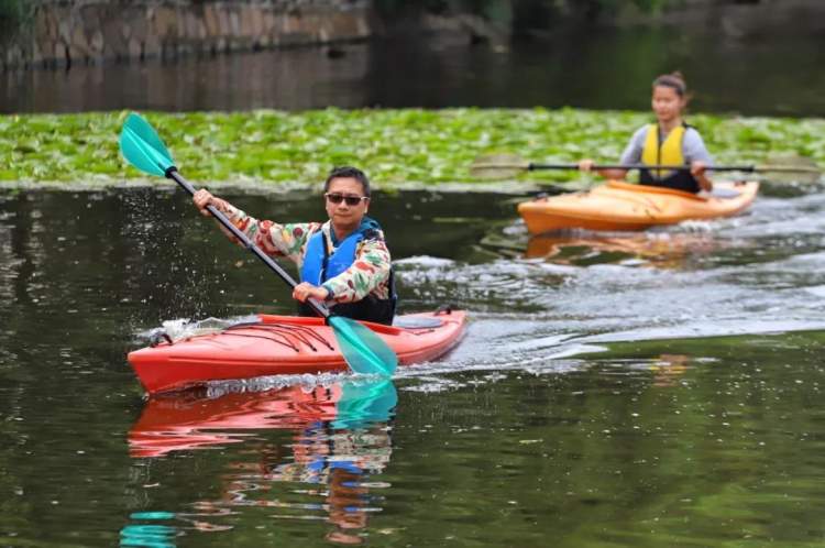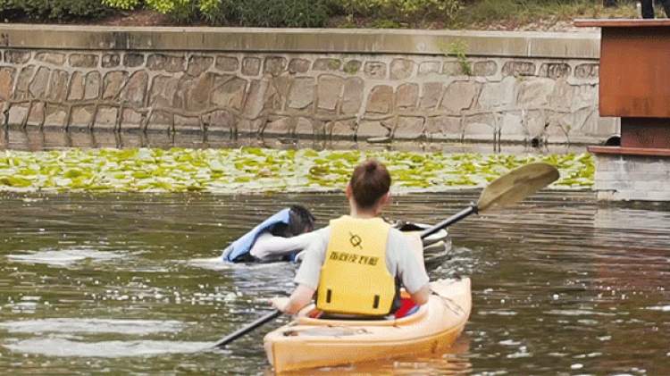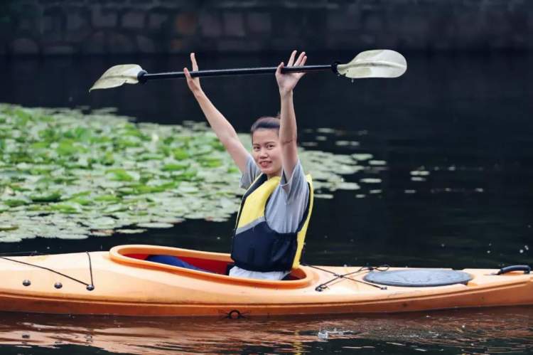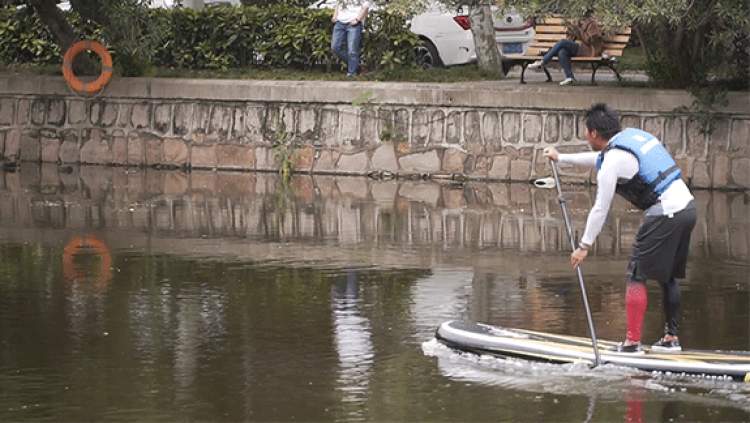 原来是华东师范大学的教职工们在最近新成立了教职工水上运动协会(简称“华师水协”)的成立大会上,邀请到专业的皮划艇教练团队和运动员们在丽娃河上为大家开展桨板、皮划艇等展示表演,在图书馆前大草坪上表演了浆板瑜珈等项目,并且向会员示范了落水后自救动作。