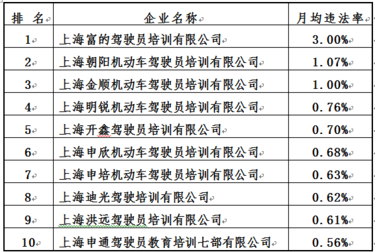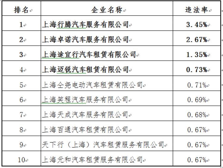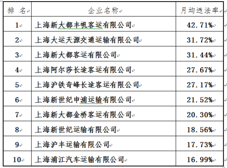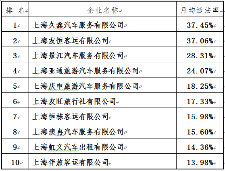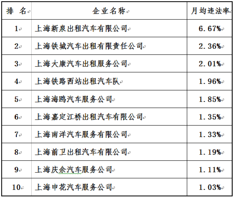 其中“锦江”月均违法率0.07%,排名第51位;“强生”月均违法率0.25%,排名第38位;“海博”月均违法率0.50%,排名第28位;“大众”月均违法率0.60%,排名第21位。