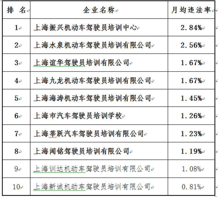 驾培行业企业(车辆数超过50辆)违法率排序(前10名)