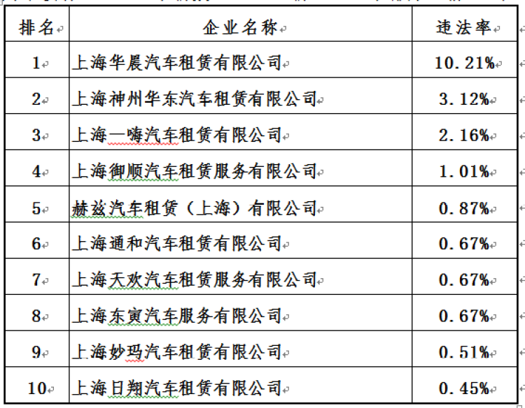 汽车租赁行业企业(车辆数超过100辆)违法率排序(前10名)