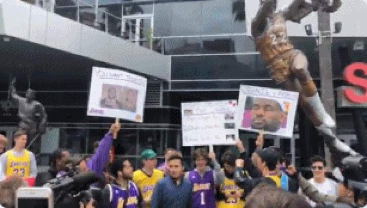 当地时间5月10日,不少湖人球迷便自发地聚集在洛杉矶斯台普斯球馆外面,对湖人管理层的不作为进行抗议。