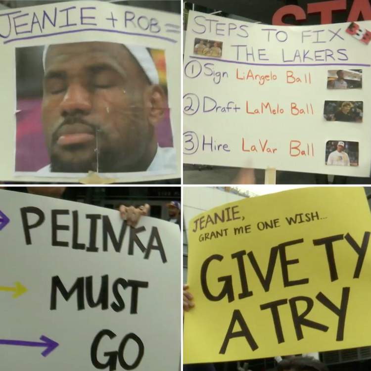 来现场抗议的湖人队球迷带来了不少自己特制的手牌,有人对球队错失泰伦·卢表示不满,举起了反对贾森·基德担任球队教练的牌子。还有“气急败坏”的球迷提出了一个特别的理论:“让湖人复苏的三个步骤,依次将球哥家族的人带进湖人队。”