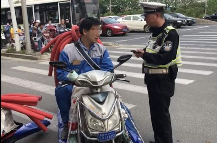 5月10日,松江交警在沪松公路九亭大街路口,拦下三辆后座捆绑着大捆红色软管的电动车,三车所载软管均超出车身长度约半米,看起来十分危险,周围车辆及行人看见都避而远之。