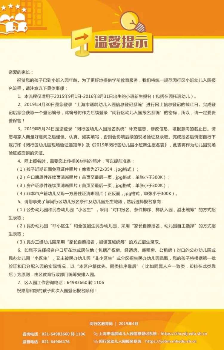 完成闵行区幼儿入园信息登记的适龄儿童家长们注意了,5月13日起,须在闵行区幼儿入园报名系统进行在线报名。