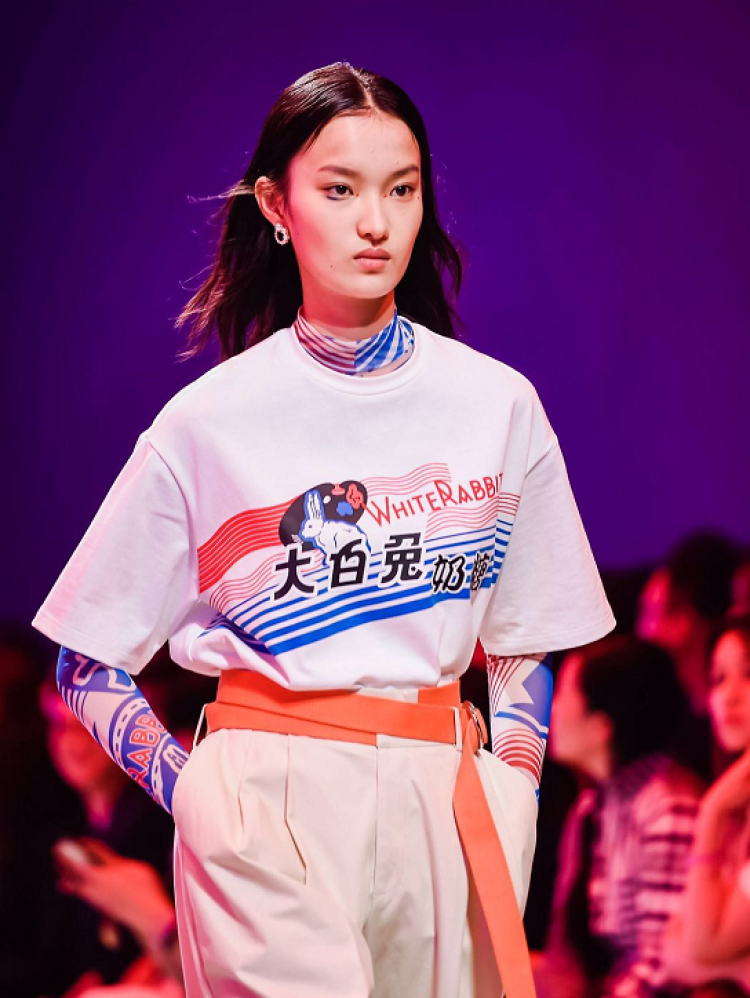 而大家最熟悉的“大白兔”形象也“跳上”了T台,展现在模特身着的T恤、外套上——联名系列里,大白兔标志性的logo以循环的手法形成轻松活泼的印花,分享最简单的温暖与快乐,传达最纯粹的生活态度。