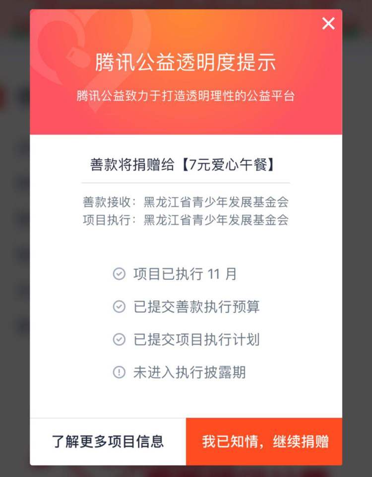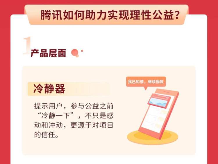 因此,腾讯于2018年3月正式推出“冷静器”产品,用户在腾讯公益平台上捐款时,会强制跳出提示页面,引导用户详细了解项目情况后再做捐款决策。