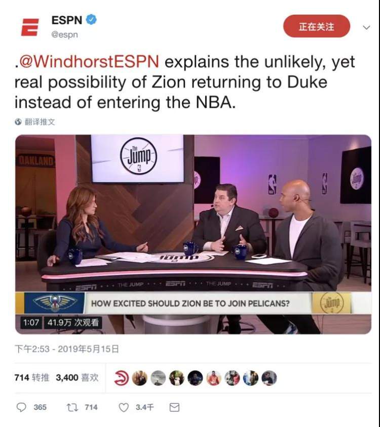 所谓的“回杜克都不去鹈鹕”的消息其实是源自美国篮球记者Brian Windhorst在做客The Jump节目时的一段猜测。在被主持人问到威廉森的未来时,他提到,回到杜克再战一年同样是威廉森的一个选项,但同时他也明确表示,这种情况发生的可能性其实微乎其微。这条消息之所以会被不少媒体放大,很大一部分是因为状元签最终的归属出乎了众人的意料。