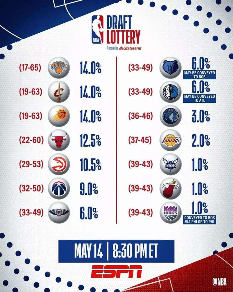 今年的乐透抽签仪式首次采用了新制度,本赛季常规赛战绩最差的三支球队尼克斯、骑士和太阳抽中状元签的概率都为14%,而不是过去根据战绩由低到高分别手握25%、19.8%和15.6%的概率,这也是联盟为了避免有球队为了状元签无脑摆烂的情况发生而做出的规则改变。