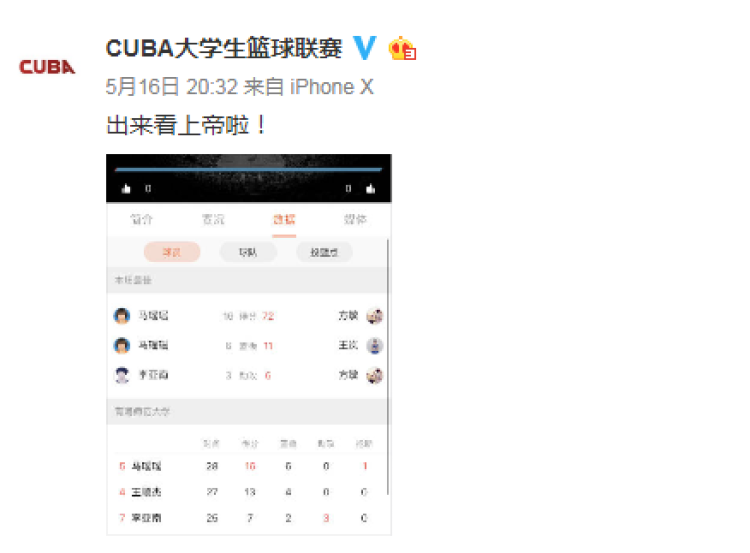 虽然CUBA赛事的关注度并不高,但如此惊天数据还是让方敏迅速走红社交网络。CUBA大学生联赛的官方社交媒体都被她折服,半致敬半调侃地表示,“出来看上帝!”而方敏赛后也在社交媒体上回应,“不敢当不敢当!”