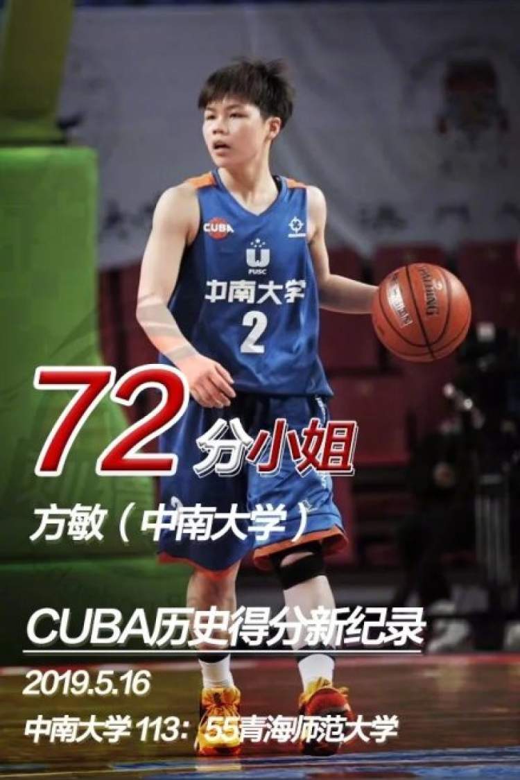 北京时间昨天,在一场CUBA全国赛女子组的比赛中,中南大学113:55大胜青海师范大学,其中中南大学球员方敏打出了惊人表现,单场砍下72分6助攻5篮板,72分的得分也创下了CUBA男女篮的单场最高得分纪录。