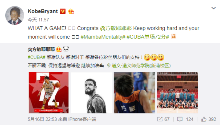 令方敏没想到的是,自己的表现还得到了前NBA球星科比·布莱恩特的关注,这位NBA单场81分神迹的缔造者通过社交媒体向方敏表示祝贺,“震撼的比赛!祝贺方敏,始终保持努力,你的时代就会来临!”
