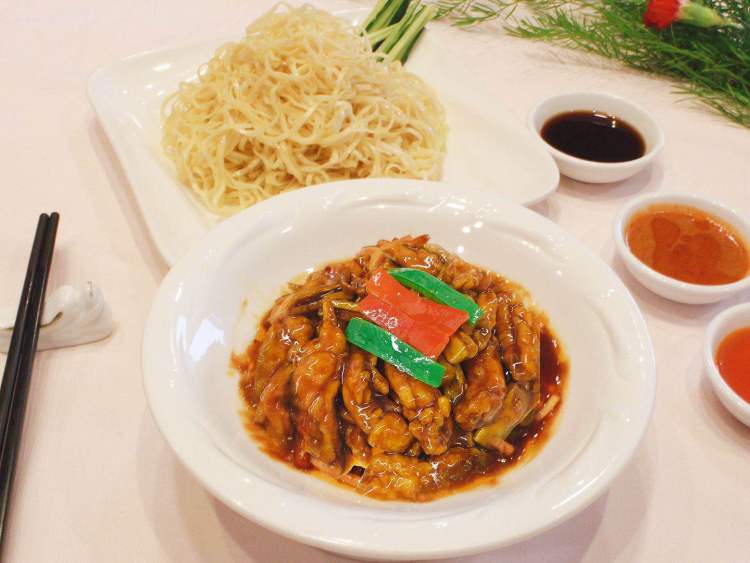 经过拆骨后的鸡腿肉经过油炸,最后淋上带有酸甜辣口感的宫保酱汁,即大功告成。