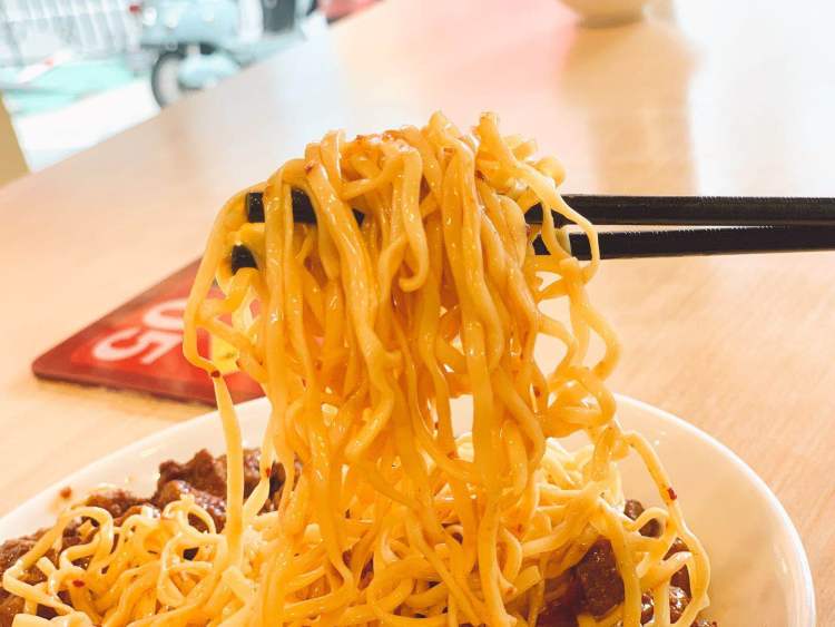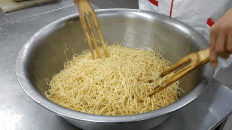 面条先蒸后煮,然后趁热浇上食用油,最后师傅边用电风扇吹边用筷子不停的挑拌,这样做出来的冷面表面微干,口感硬韧滑爽又有嚼劲,完全不会粘牙。