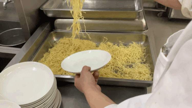 冷面师傅的手势一看就是拥有多年经验的“老法师”,挑起面条的同时还对冷面进行了摆盘“塑型”。