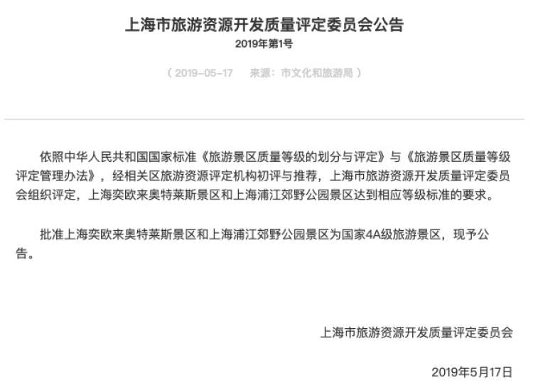 好消息,上海新增2家全国4A级旅游景区,快来看看在哪里? 李晓明 2019-5-17 来源:周到上海 好消息,上海又新增了2家国家4A旅游景区。周到君从市文化和旅游局获悉,上海奕欧来奥特莱斯景区和上海浦江郊野公园景区新批准为国家4A级旅游景区。 市文旅局公告称:依照国家标准《旅游景区质量等级的划分与评定》与《旅游景区质量等级评定管理办法》,经相关区旅游资源评定机构初评与推荐,上海市旅游资源开发质量评定委员会组织评定,上海奕欧来奥特莱斯景区和上海浦江郊野公园景区达到相应等级标准的要求,被批准为国家4A级旅游景区。 来源:周到上海 作者:李晓明 赞一个 (12)