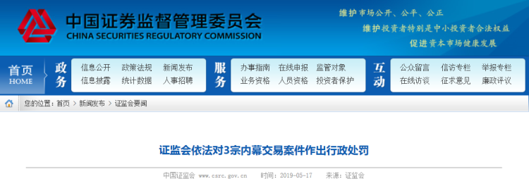 中国证监会官网,证监会依法对3宗内幕交易案件作出行政处罚。