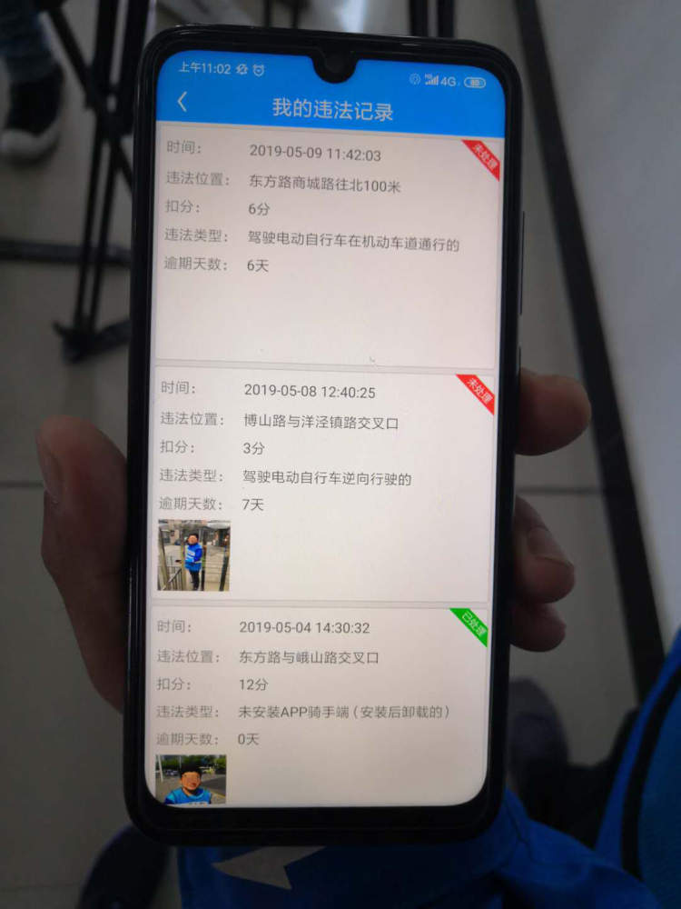 罗其远并不知道,无论是监控探头拍摄的交通违法,还是交警的现场处罚,都被记录在了这款“交通文明记分管理APP”内:5月8日中午,他在博山路与洋泾镇路交叉口骑电动自行车逆行被记3分;5月9日中午,又因骑电动自行车在机动车道内行驶被记6分;4月25日、4月30日、5月4日,他先后3次安装后卸载APP也都被记录下来,每次分别被记12分。