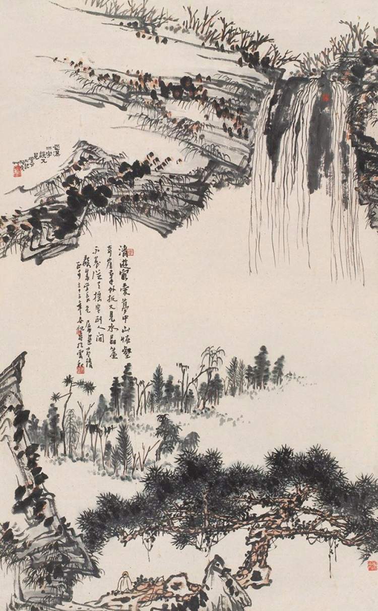 曾履川闻知,便写信来慰问并索画,这就是张大千创作此幅《云山图》的背景。而张大千晚年创作的泼彩山水,借鉴了抽象表现主义的某些因素,但看上去又全是中国气派,因此他把中西方艺术结合达到了一个时代的顶峰。