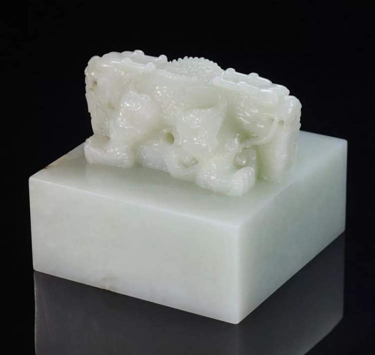 一方“清乾隆 御制白玉交龙钮‘信天主人’宝玺”,选材精到奢侈,印钮雕刻十分精细,且体量巨大,是乾隆皇帝所有“信天主人”宝玺中最大的一方。