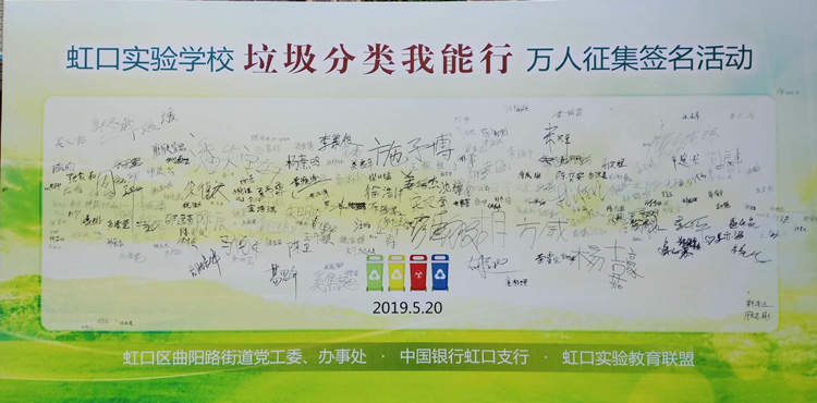 今天上午,虹口区曲阳路街道在虹口实验学校举行《“垃圾分类我能行”实践记录手册》发放暨万人征集签名活动仪式。
