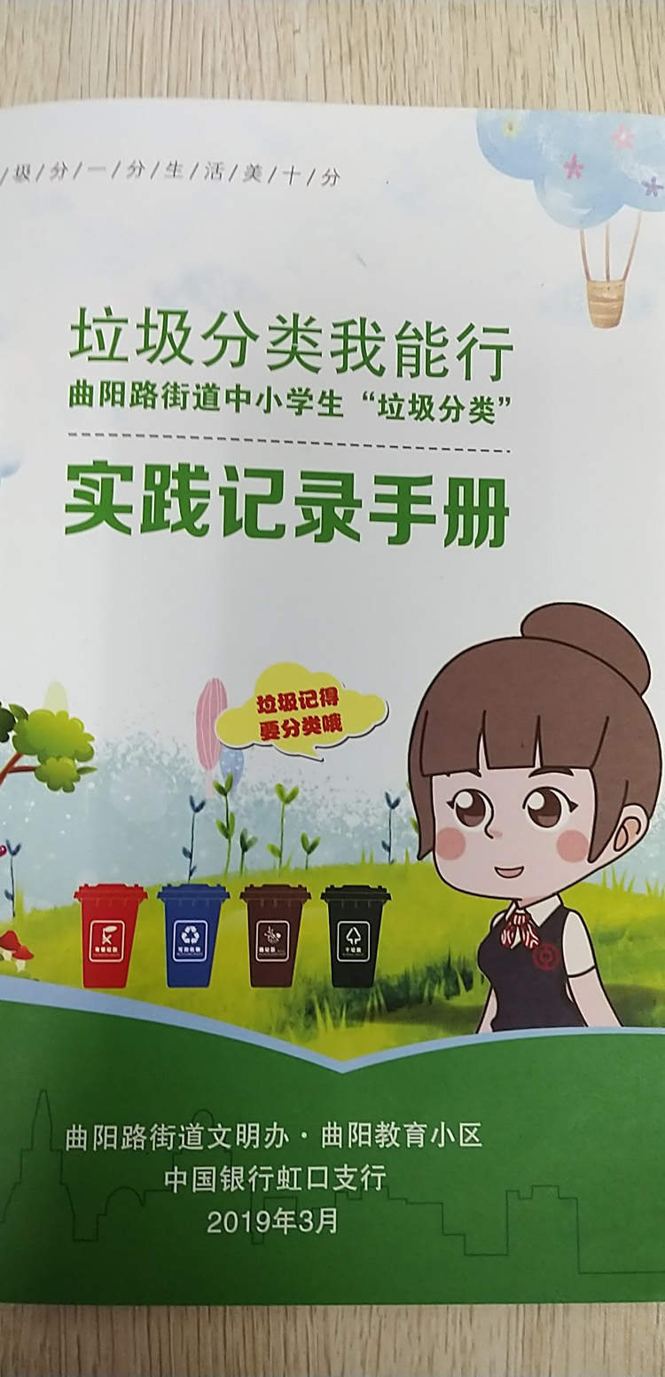 曲阳路街道内的17所中小学校及幼儿园万名中小学生,每人都将有一本《“垃圾分类我能行”实践记录手册》。学生每天回家后记录家中垃圾分类的情况,从小养成垃圾分类的习惯,并督促家长做好垃圾分类工作。
