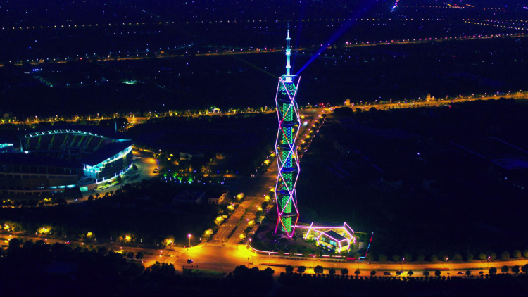 金山广播电视塔为金山区地标性建筑之一。七彩渐变的绚烂灯光打破了城市常规的静态夜景,流光溢彩、璀璨夺目,为城市天际线披上了一道绚丽的“光影霓裳”,被广大市民亲切地称为“钻石塔”。