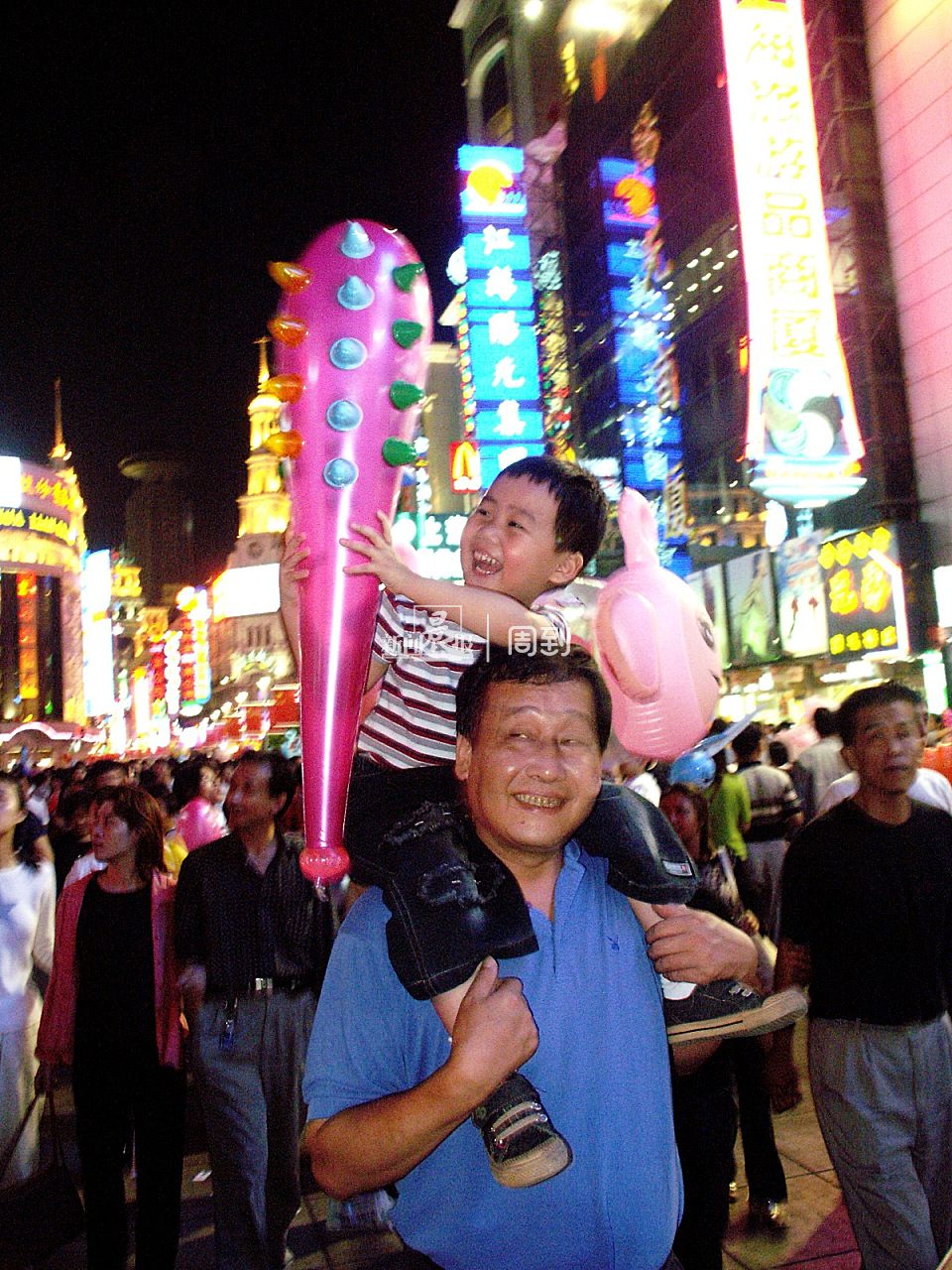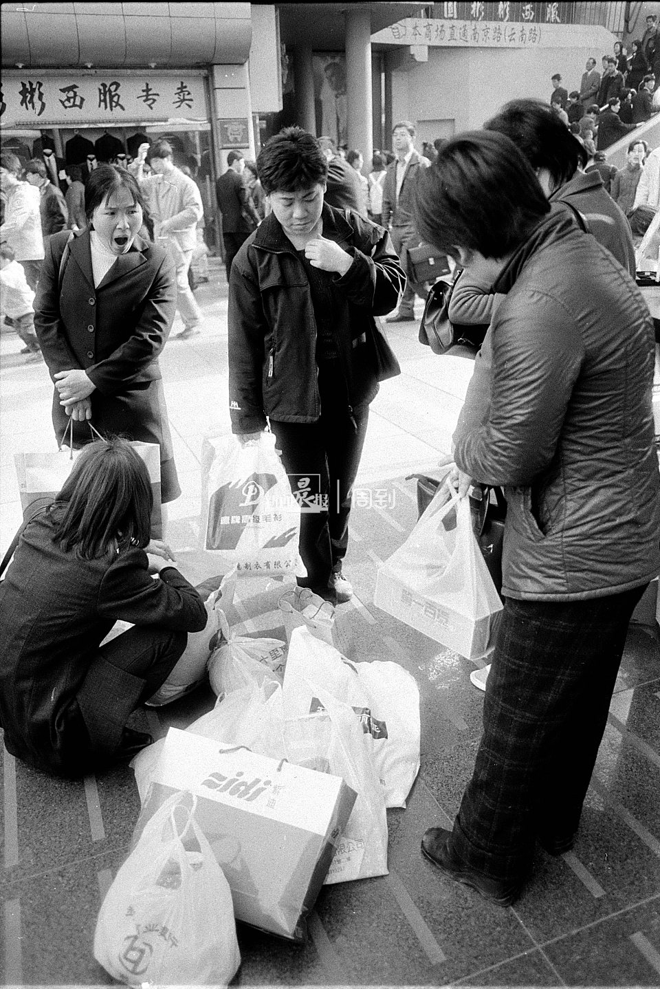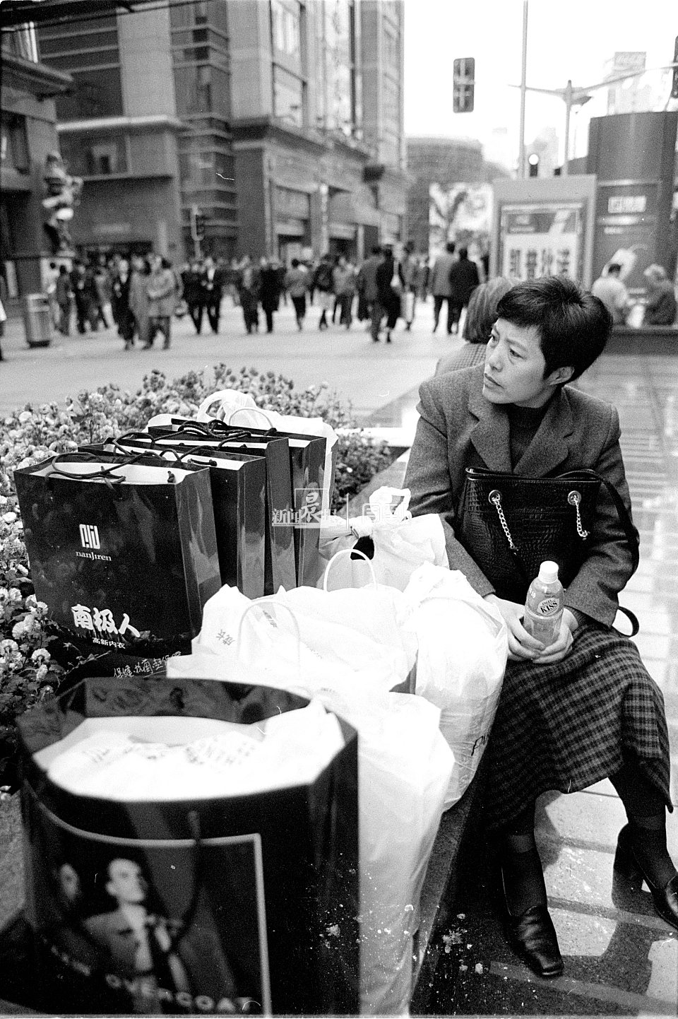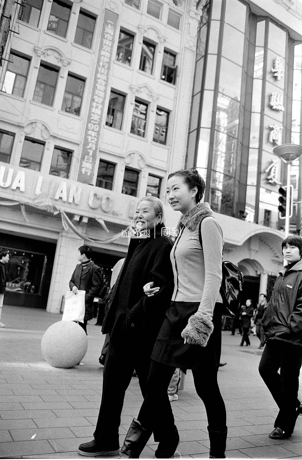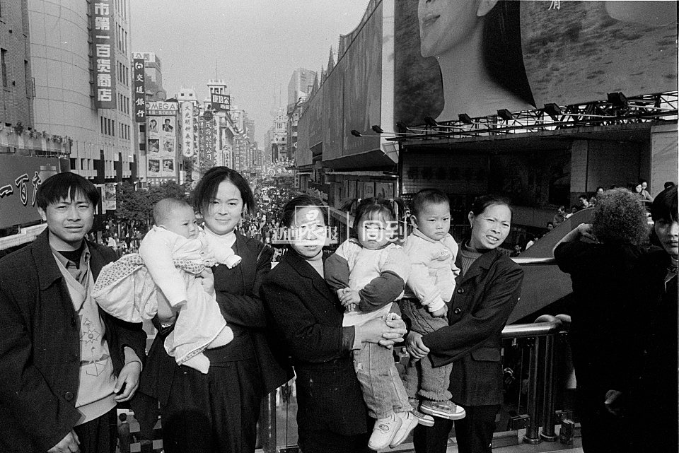 2001年3月,逛完步行街的一家子在天桥上留影。