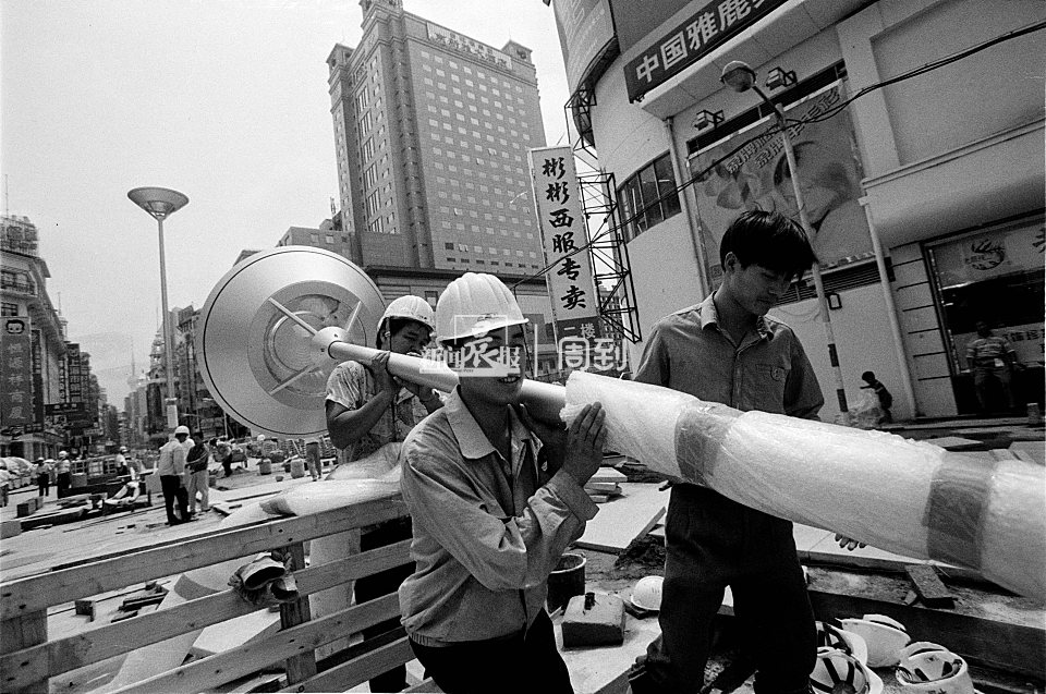 1999年8月15日,步行街改建工地上工人们正在竖起一盏盏路灯。