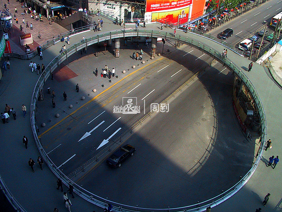 南京东路西藏路口圆形人行天桥建于1985年12月29日,是上海城市中心一标志性的景观。天桥4个转角处8部回转式扶梯分别通向桥侧第一百货商店、当时的精品商厦等商店楼层取道穿行。