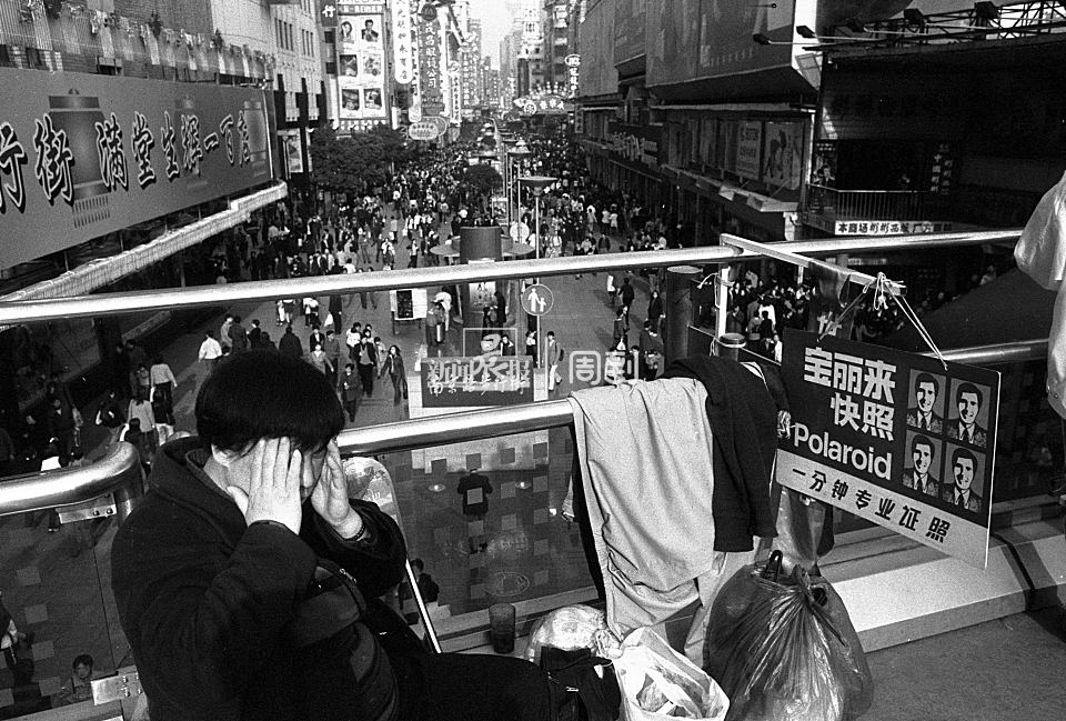 2001年3月,天桥上摄影摊没啥生意,摊主晒着太阳。