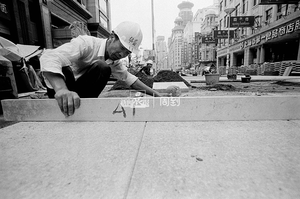 1999年8月15日,一名工人正在铺设地砖,整条步行街铺设花岗石路面共3.29万平方米。