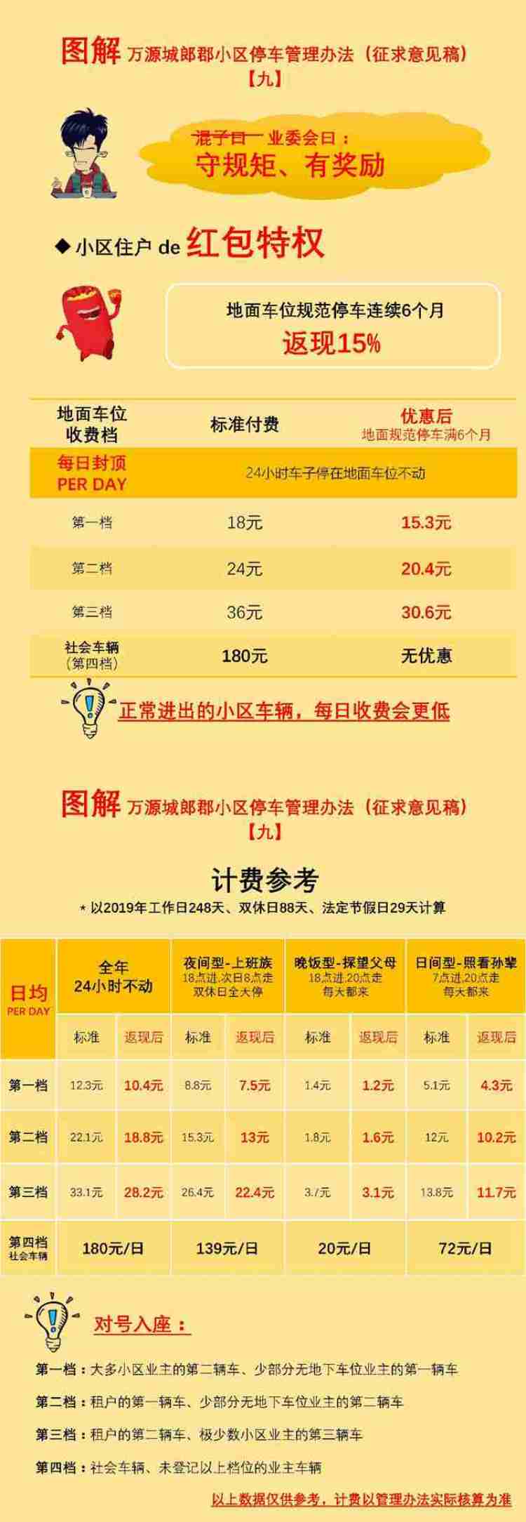 一些年轻业主很快领悟了停车方案的关键所在,一位热心的女业主还将文字化作了图表的形式,并且以“守规矩、有奖励”为名,为业主们详细计算了四档停车收费所能享受到的精确到角的优惠。
