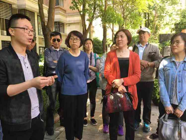 ■万源城朗郡的业委会。蓝色T恤为何逸青,灰色西装为李青。摄影:李芹。