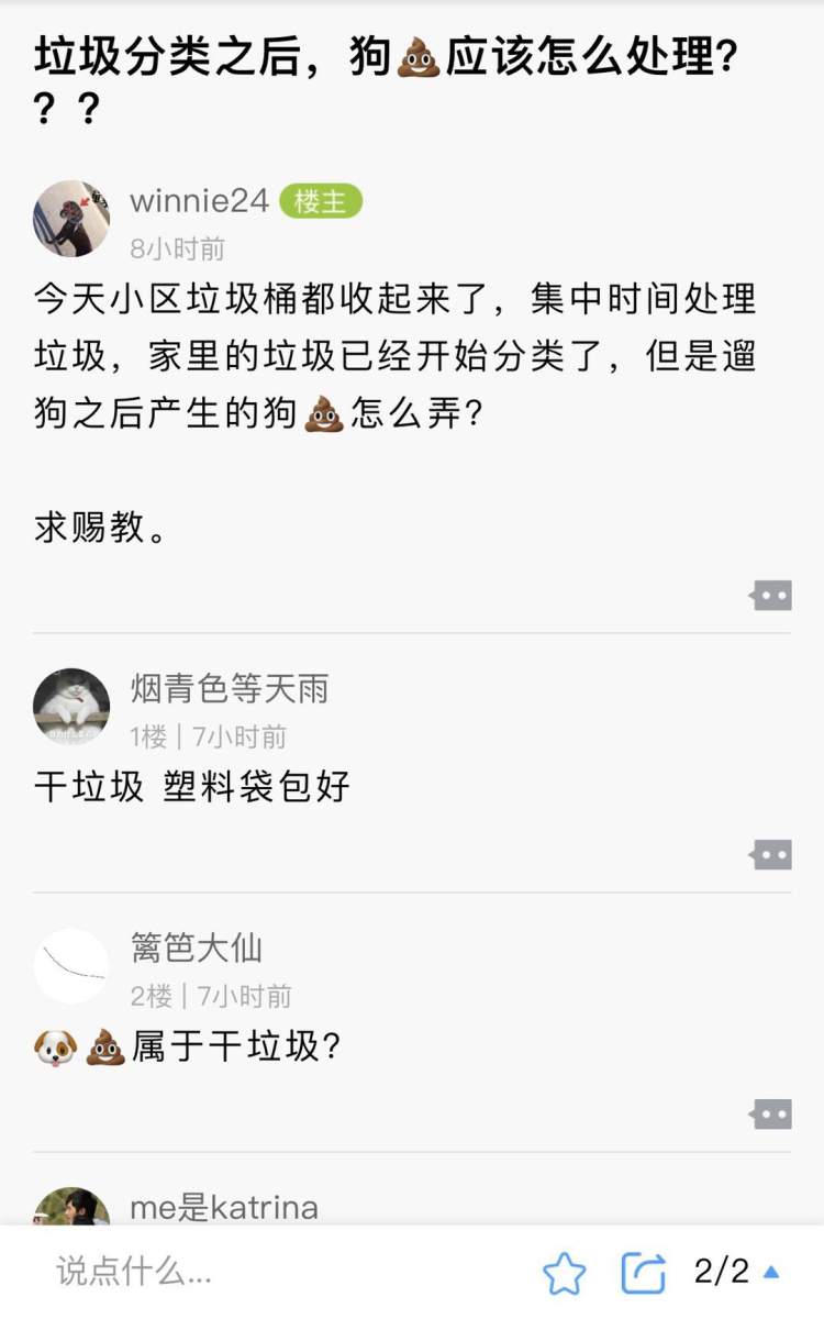 网友winnie24在篱笆闲聊上说,今天小区的垃圾桶都收起来了,集中时间处理垃圾,家里的垃圾开始分类了,但是遛狗时产生的狗屎怎么弄?
