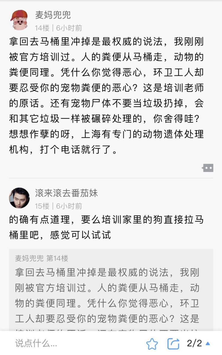 也有网友回复说,在日本也是将狗屎带回家冲入马桶的;还有人回复,自家狗的大便,有什么觉得腻心的?