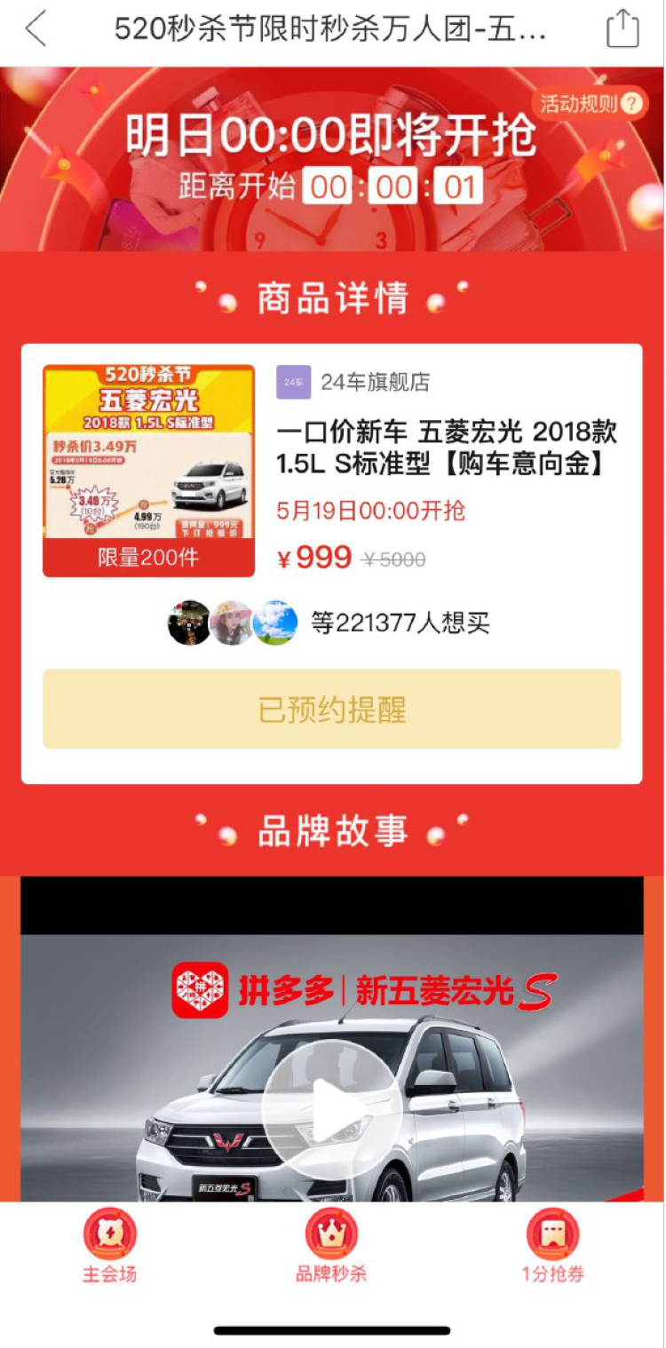 5月20日,共有22万消费者在拼多多平台预约五菱宏光秒杀活动,当日平台分三批投放的1000辆车全部售罄。