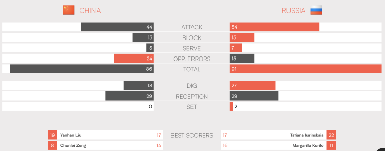 在关键的第三局,中国队开局与对手周旋,一度将比分追至9平,但此后俄罗斯打得比较巧妙,利用吊球屡屡得手,而中国队则失误较多,后排防守起伏较大,导致分差逐渐加大,中国队以16:25大比分失利。
