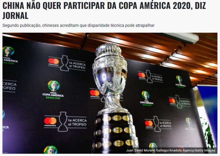 2019年美洲杯将于下月在巴西举办,据当地媒体《环球体育》报道称,由阿根廷和哥伦比亚联合举办的2020年美洲杯也已经进入了最后准备阶段。此外,中国男足回绝了美洲杯的参赛邀请。