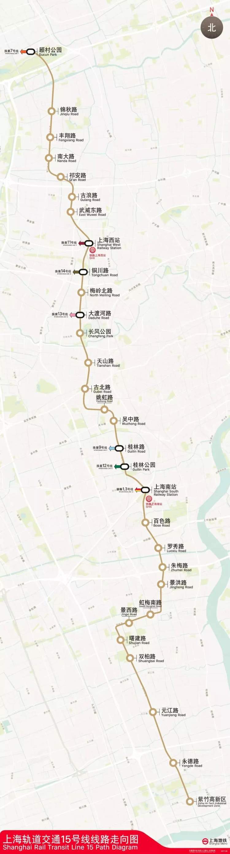 15号线从北往南穿越5个行政区,全长约42.3公里,途经宝山、普陀、长宁、徐汇、闵行5个行政区,起自宝山顾村公园,止于闵行紫竹高新区。竣工运行后将大大改善上海西部地区南北向交通,加强城市西部内外环线间的交通运力。