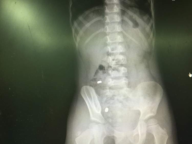 经影像检查——2粒电池已经“抵达”小肠!医生告知家长,电池一旦破损,碱性化学物质泄露,即会灼伤胃肠黏膜,造成出血,甚至穿孔,后果不堪设想。由于电池位于小肠,胃镜技术已经无能为力,需要手术治疗。