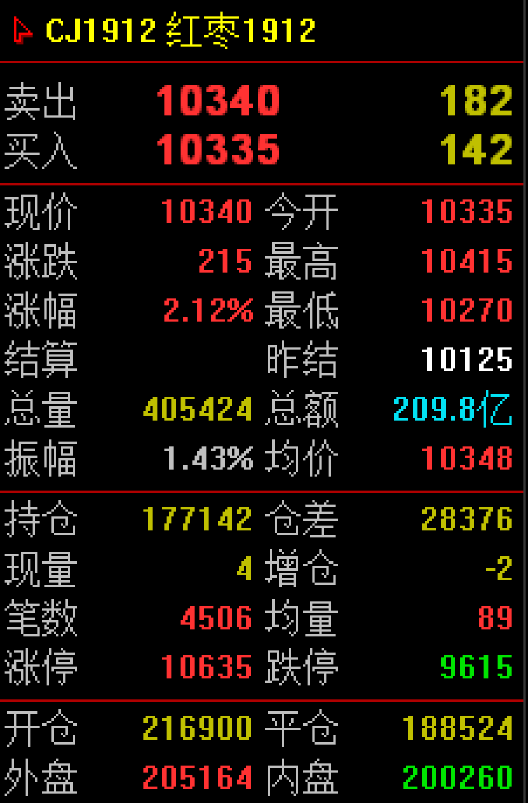 今早,红枣期货又是高开,截至周到君发稿,郑州商品交易所红枣期货主力CJ1912合约报10340元/吨,较昨日收盘价涨幅2.12%。