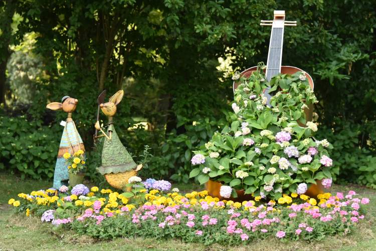 今年园方为了进一步提升八仙花园的景观效果,从植物配比和园艺景观等方面对八仙花园进行了优化升级。在保留去年大部分长势较好、适应性强、观赏良好的品种之外,新引进了20余种观赏性较强的八仙花品种,如“马雷夏尔”、“蓝色妈妈”、“卡米拉”、“甜蜜梦想”等。同时针对不同区域的景观效果,新增了铁艺蝴蝶、卡通袋鼠等装饰小品,和花园内日式枯山水、欧式拱门等元素有机结合,营造出各具特色的园艺景观效果。