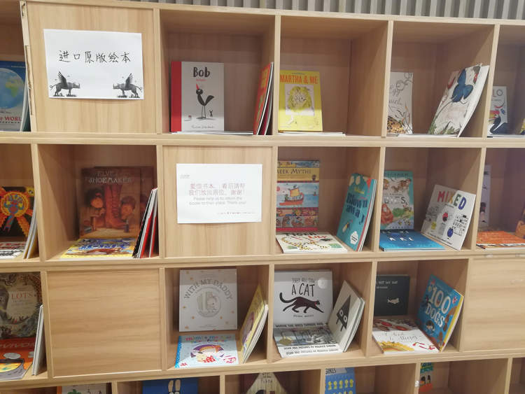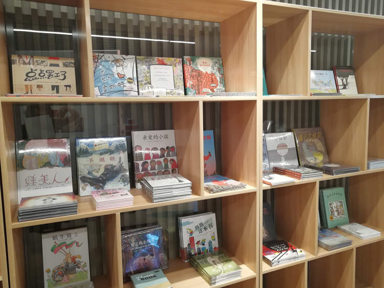展厅的中间是周边贩卖区,有进口的原版绘本,也有国内出版社的译制版本。