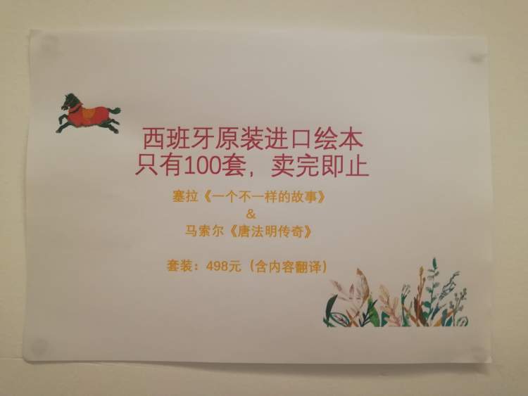 馆内也张贴了说明:塞拉的《一个不寻常的故事》和马索尔的《唐法明传奇》这两本西班牙原装进口绘本展馆内只有100套(498元/套),卖完即止。